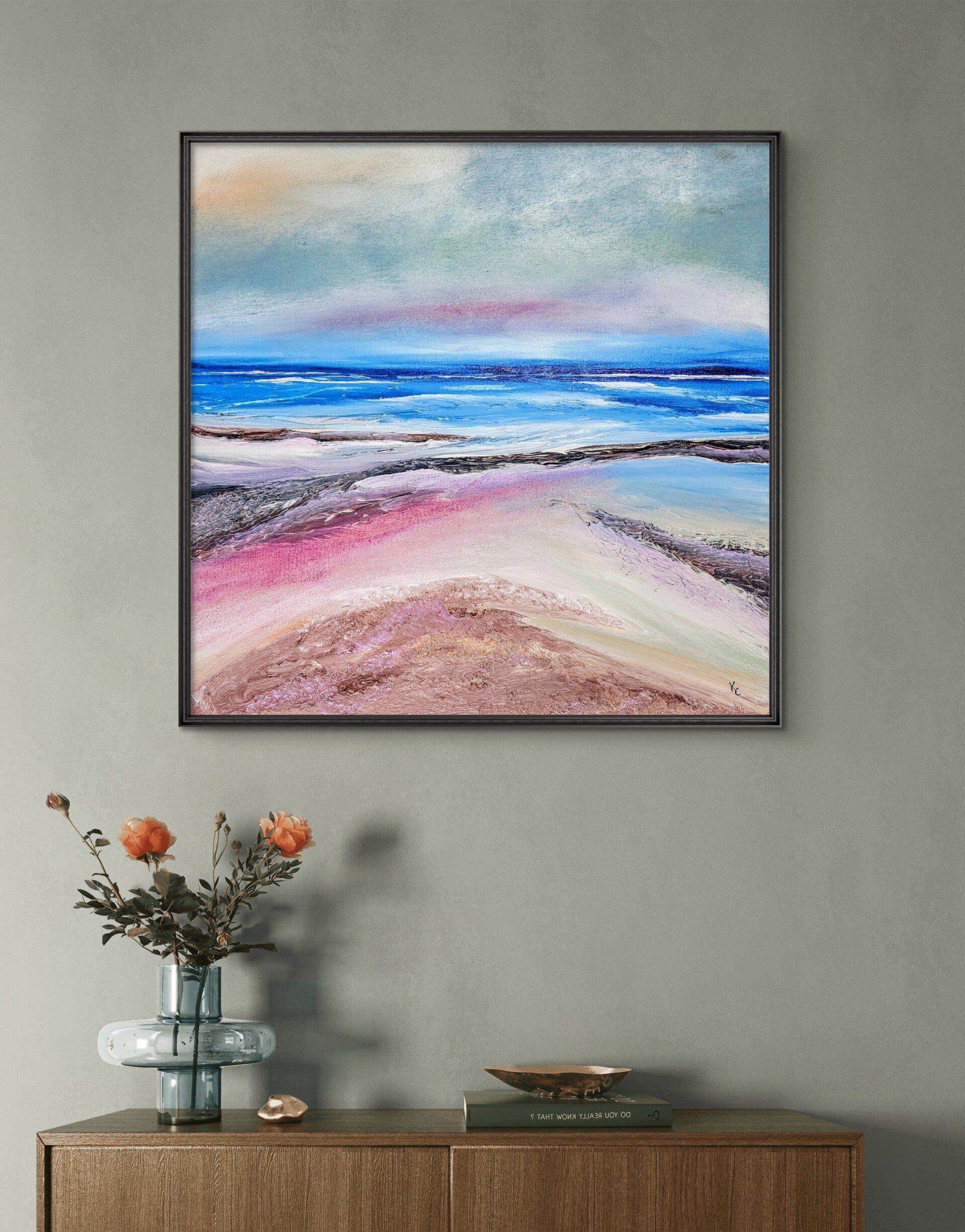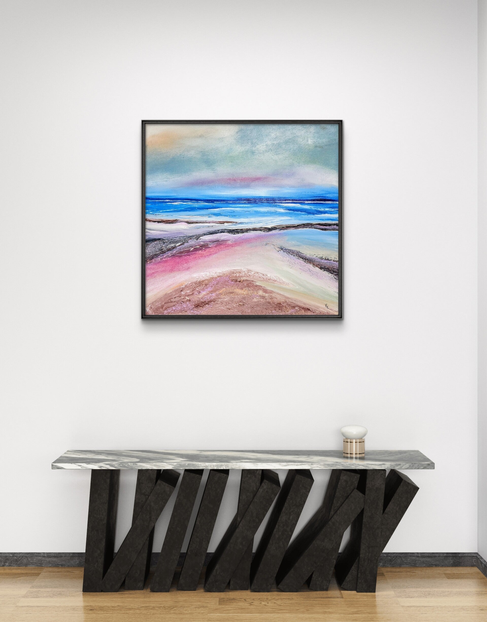 Framed landscape/seascape painting. Crafted with acrylic on canvas board, this artwork is not only visually stunning but also comes ready to hang, making it hassle-free for you. Its timeless beauty will undoubtedly enhance any room in your home. Whether you're looking to create a serene atmosphere or add a touch of nature's tranquility, this piece is sure to captivate. We invite you to bring this exquisite artwork into your home and experience the joy it can bring