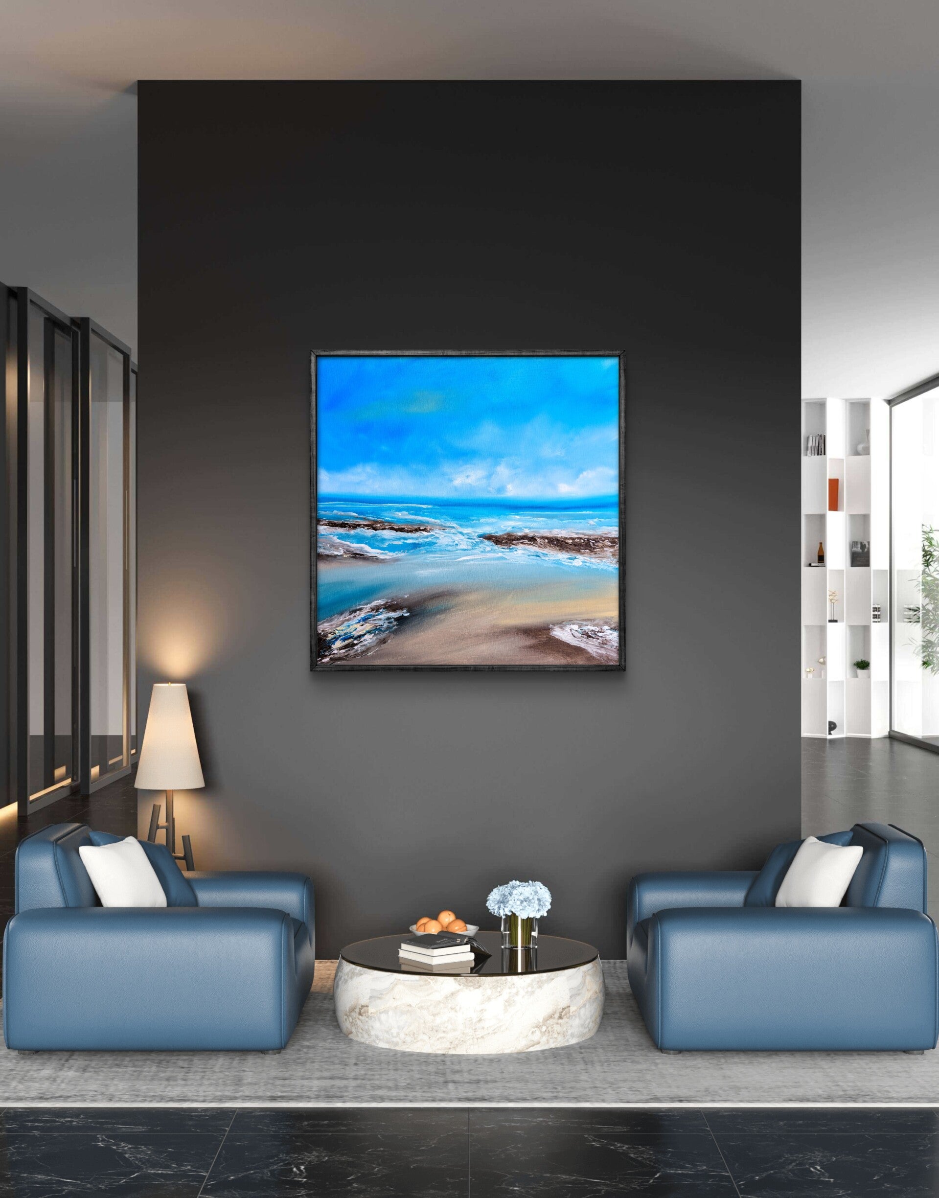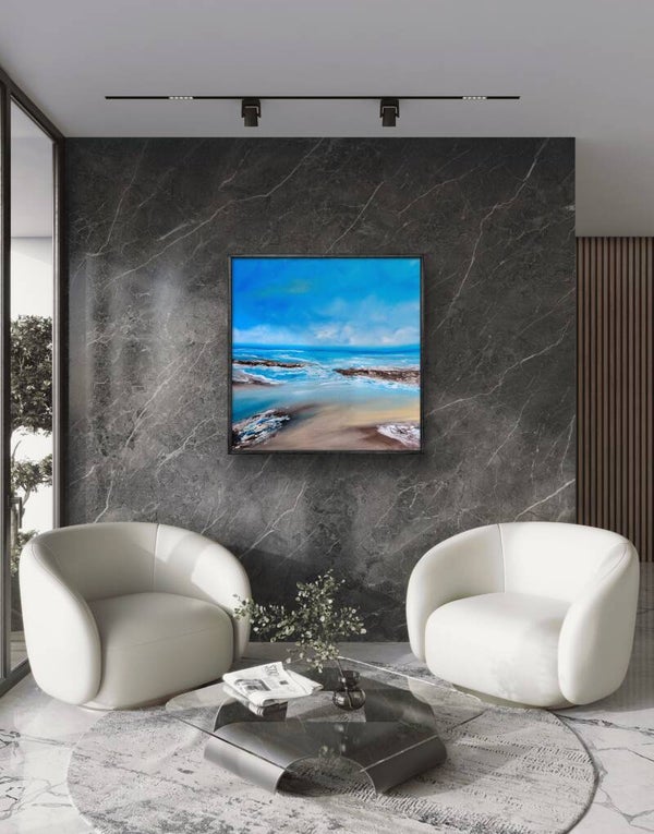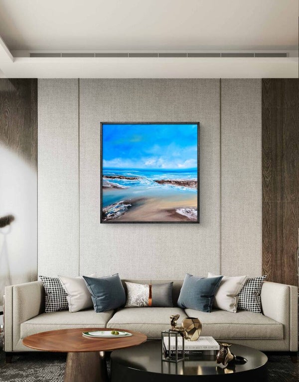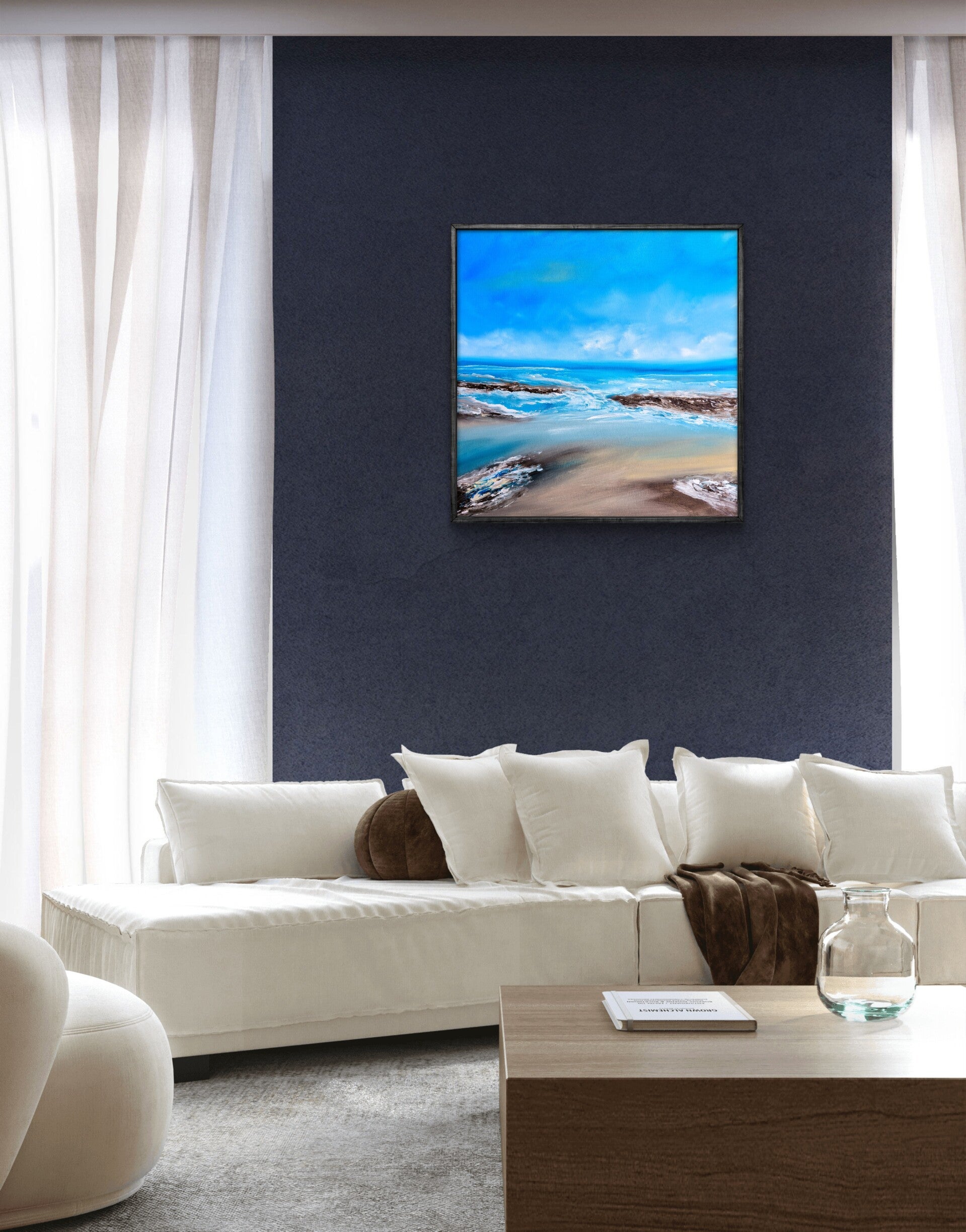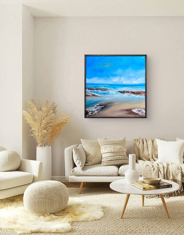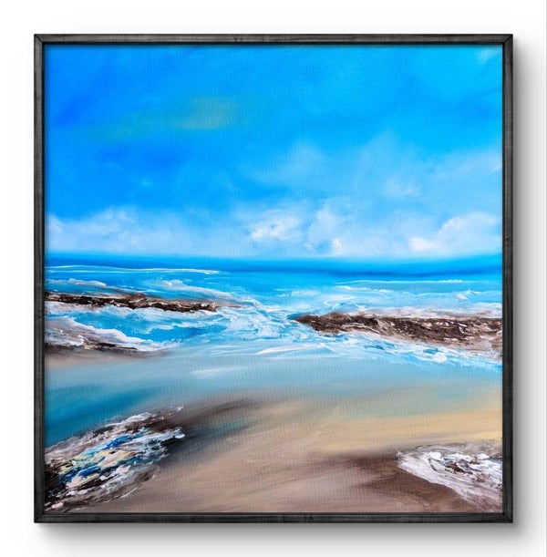 Framed landscape/seascape painting. Crafted with acrylic on canvas board, this artwork is not only visually stunning but also comes ready to hang, making it hassle-free for you. Its timeless beauty will undoubtedly enhance any room in your home. Whether you're looking to create a serene atmosphere or add a touch of nature's tranquility, this piece is sure to captivate. We invite you to bring this exquisite artwork into your home and experience the joy it can bring